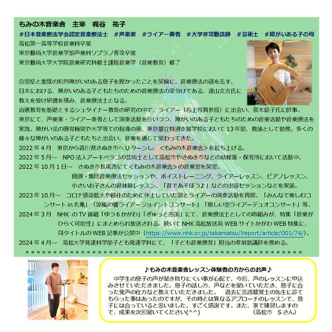 もみの木音楽舎が毎月 1 日だけ、高松市内において個別セラピー&レッスンを実施する、